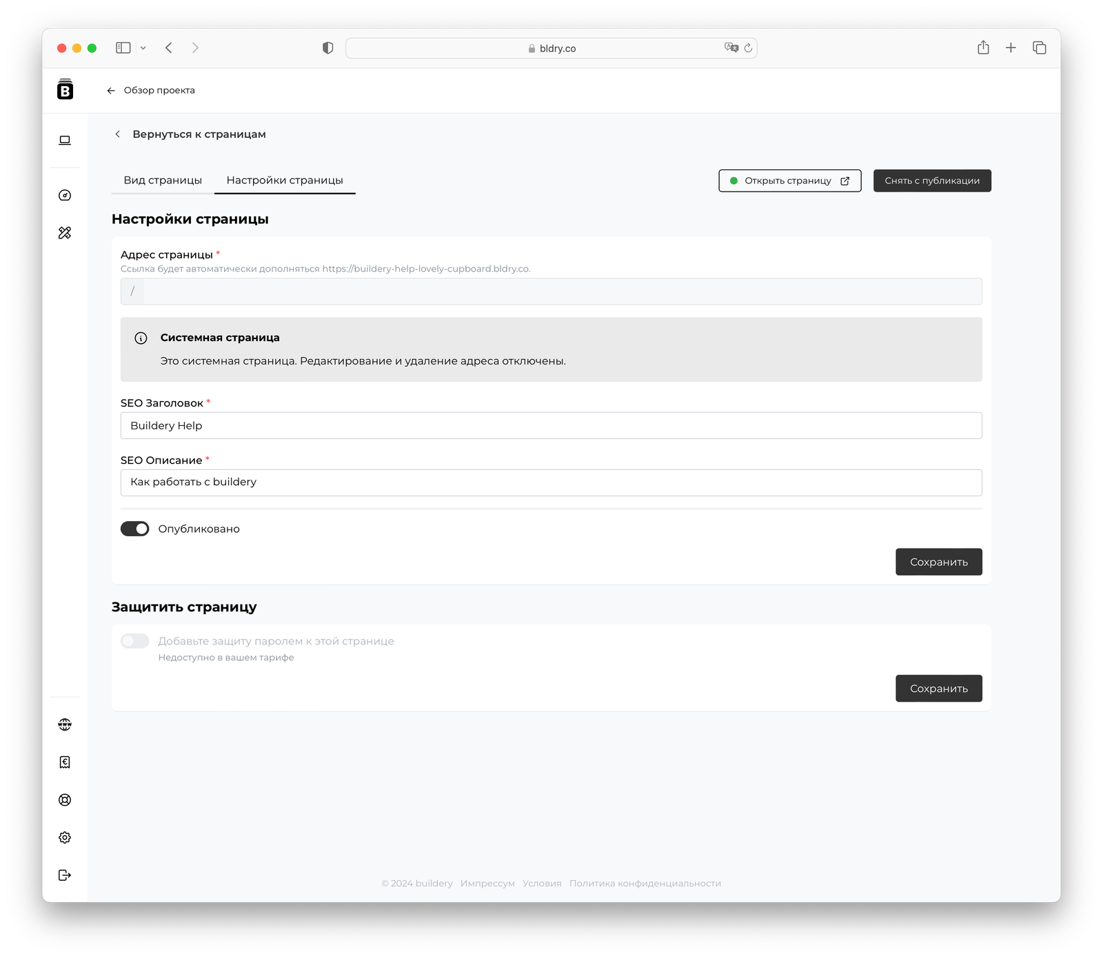 Перейдите на вкладку Настройки страницы. Здесь вы можете добавить SEO заголовок (как страница будет называться в сети. Менять адрес страницы возможно лишь для несистемных, дополнительно созданных страниц.